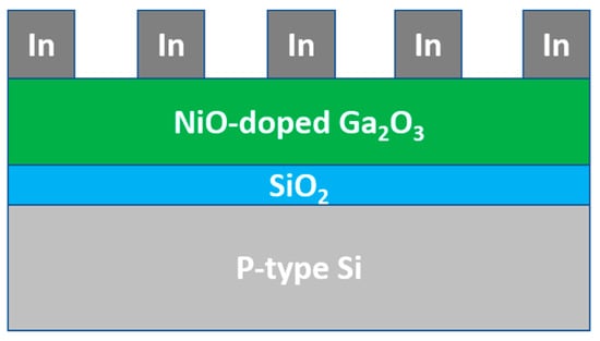 Because WBG semiconductors provide notable improvements in system performance, energy efficiency, and reliability, they are ideal for next-generation applications in power electronics, electric vehicles, renewable energy, and beyond [7]. In the past, various methods have been explored for depositing Ga2O3 thin films, even those not in the β phase [8]. For example, Aleksandrova et al. used radio frequency sputtering with a commercially available target (ZnO/Ga2O3 = 95/5 wt.%) to deposit ZnO-doped Ga2O3 thin films [9], while Liu et al. employed capacitively coupled plasma-assisted magnetron sputtering to deposit amorphous Ga2O3 thin films [10]. However, the use of an electron beam (e-beam) system for depositing Ga2O3 thin films has been relatively limited. This study primarily focused on using the e-beam method to deposit Ga2O3 thin films. The key advantages of e-beam evaporation include high deposition rates, high-quality thin films, and high-purity thin films, as the material is typically evaporated in a vacuum. It also allows for precise control over the thickness of the deposited thin films, as the deposition rate can be carefully regulated by adjusting the e-beam power. E-beam evaporation is versatile and can be used to deposit a wide range of materials, including metals, alloys, ceramics, and some organic compounds. In the case of the NiO-doped Ga2O3 thin films we use, NiO and Ga2O3 are co-evaporated during the deposition process, allowing for the possibility of naturally forming compounds. In order to use Ga2O3 thin films for semiconductor device fabrication, many studies have focused on doping Ga2O3 with various impurities to create n-type semiconductor thin films [11,12].