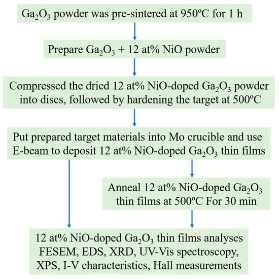 (6) Following these characterizations, electrical property analyses were conducted using the Agilent B1500A to measure the I-V characteristics of the thin films with deposited electrodes. The measurement range was set from −2V to 2V to obtain the I-V characteristic curve. Additionally, Hall measurements were performed to assess the carrier concentration, mobility, and resistivity of the NiO-doped Ga2O3 thin films. The schematic diagram to obtain the various NiO-doped Ga2O3 thin films and the different analyses for the various NiO-doped Ga2O3 thin films is shown in Figure 2.