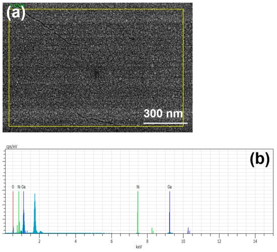 EDS analysis of the 500 °C-annealed NiO-doped Ga2O3 thin films: (a) analysis area and (b) analysis result.