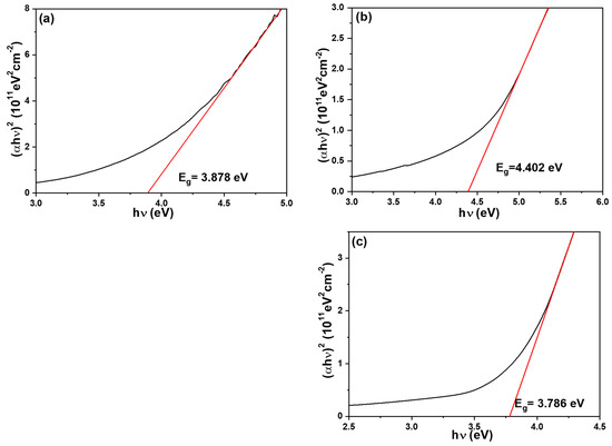 Tauc plots of (a) un-annealed, (b) 500 °C-annealed NiO-doped Ga2O3 thin films, and (c) un-annealed and undoped Ga2O3 thin films.
