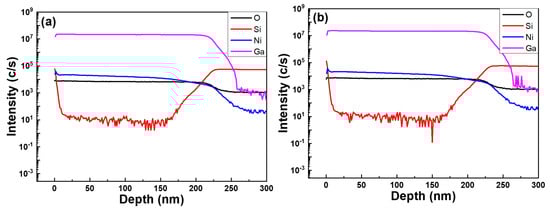 SIMS analysis results of Ga, Ni, Si, and O elements of (a) un-annealed NiO-doped Ga2O3 thin films and (b) 500 °C-annealed NiO-doped Ga2O3 thin films.