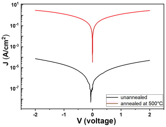 Current–voltage properties of the un-annealed and 500 °C-annealed NiO-doped Ga2O3 thin films.