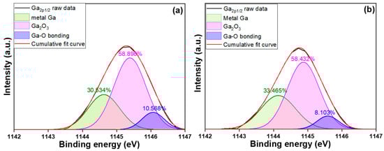 The typical Ga2p3/2 peaks of the un-annealed NiO-doped Ga2O3 thin films and 500 °C-annealed NiO-doped Ga2O3 thin films, centered at 1118.03 and 1118.63 eV, respectively, are shown in Figure 8a,b. For the un-annealed NiO-doped Ga2O3 thin films (500 °C-annealed NiO-doped Ga2O3 thin films), this peak consisted of three components: the GaI peak at 1117.96 (1117.40) eV, attributed to metallic Ga-Ga (or Ga-Ni); the GaII peak at 1118.71 (1118.15) eV, associated with the Ga2O3 structure; and the GaIII peak at 1119.40 (1118.86) eV, corresponding to the Ga-O bond or high-oxidation-state Ga species formed on the surface or interface, such as Ga(OH)3 or hydrated oxides [18]. In p-type semiconductors, conductivity primarily depends on the holes’ concentration. Therefore, any alteration in the chemical environment that weakens the supply or mobility of holes will result in a decrease in conductivity. The enhancements of the Ga(OH)3 or Ga-OH peaks (representing surface-adsorbed water or oxides) may contribute to this conductivity drop. This is because surface species such as Ga(OH)3 can influence the carrier concentration in the surface layer, reducing the effective hole concentration and, consequently, lowering the material’s conductivity. As shown in Figure 8, when NiO-doped Ga2O3 thin films are annealed at 500 °C, the area of the GaIII peak decreases from 10.224% to 7.864%, which demonstrates that the 500 °C-annealed NiO-doped Ga2O3 thin films can exhibit improved conductivity. The typical Ga2p1/2 peaks of the un-annealed NiO-doped Ga2O3 thin films and the 500 °C-annealed NiO-doped Ga2O3 thin films are compared in Figure 9, and their binding energies are centered at 1147.70 and 1145.36 eV, respectively, as shown in Figure 9a,b. By comparing the analysis results of Figure 9 and Figure 10, we observe that the XPS trend of the Ga2p1/2 peaks is similar to that of the Ga2p3/2 peaks. As shown in Figure 9, when NiO-doped Ga2O3 thin films are annealed at 500 °C, the area of the GaIII peak decreases from 10.568% to 8.103%, which also demonstrates that the 500 °C-annealed NiO-doped Ga2O3 thin films can exhibit improved conductivity.