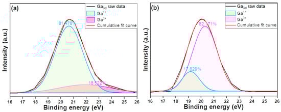 The Ga3d peak can be divided into two components: the Ga1+ peak and the GaO bonding peak. The Ga1+ peak is typically associated with oxygen vacancies or other defects, indicating that Ga atoms have lost some of their positive charge, possibly forming structures like Ga2O [19]. This peak suggests that a portion of the gallium is in a reduced state, which can impact the overall properties of the material. Conversely, the GaO bonding peak represents the typical Ga-O bond, where gallium predominantly exists in the form of Ga3+. This reflects the normal chemical bonding between gallium and oxygen atoms, indicating a stable and well-formed network within the material. Figure 10a shows that the Ga3d peak of an un-annealed NiO-doped Ga2O3 thin film was centered at 20.783 eV, and the Ga3d peak of a 500 °C-annealed NiO-doped Ga2O3 thin film was centered at 20.000 eV, respectively. In NiO-doped p-type Ga2O3 thin films, an increase in the Ga1+ peak can lead to a decrease in the thin film’s conductivity. NiO primarily functions as an acceptor in this context by substituting Ni2+ for Ga3+, which creates holes that contribute to p-type conductivity. Ideally, the chemical state of Ni2+-O2− should be maintained to ensure effective generation of holes. However, the presence of the Ga1+ peak introduces negative effects that reduce conductivity. Specifically, the existence of Ga1+ suggests that some gallium is in a reduced state, which tends to form stronger bonds with surrounding O2− ions.