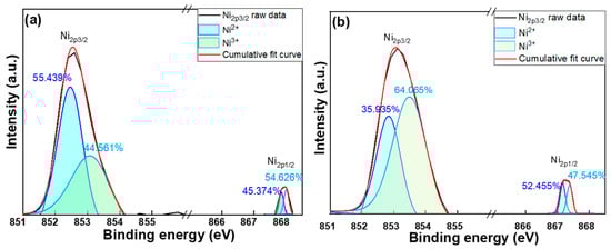 XPS spectra of the Ni2p3/2 and Ni 2p1/2 peaks and the Gaussian-resolved components of (a) un-annealed NiO-doped Ga2O3 thin films and (b) 500 °C-annealed NiO-doped Ga2O3 thin films.