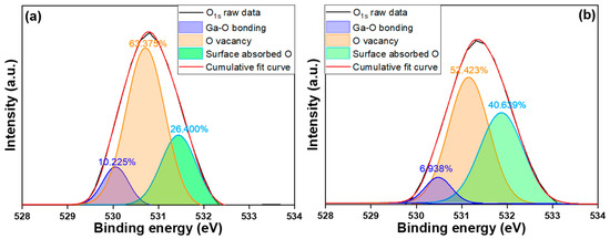 XPS spectra of the O1s peaks and the Gaussian-resolved components in (a) un-annealed NiO-doped Ga2O3 thin films and (b) 500 °C-annealed NiO-doped Ga2O3 thin films.