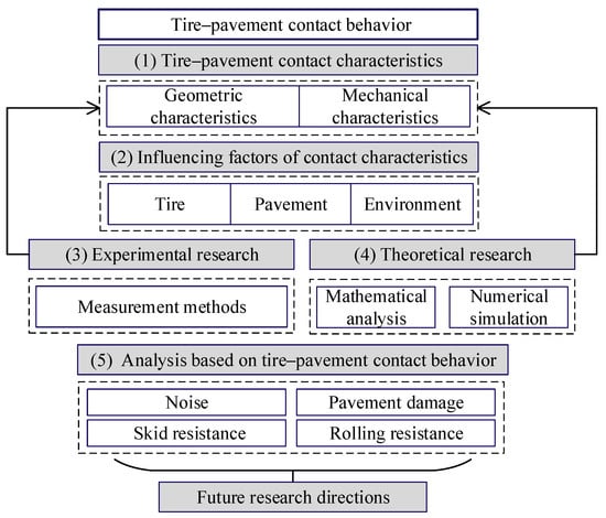 The objective of this article is to conduct a comprehensive review of the latest progress in the study of tire–pavement contact behavior. In order to achieve this objective, tire–pavement contact characteristics, factors influencing contact behavior, contact measurement methods, and theoretical research are reviewed. Firstly, the research progress on tire–pavement contact behavior is examined based on both geometric characteristics and mechanical characteristics. Secondly, the influencing factors of contact behavior are analyzed based on three aspects—the tire, pavement, and contact environment. Then, experimental research on tire–pavement contact behavior and measurement methods are summarized, and the advantages and disadvantages of different measurement methods are evaluated. Finally, tire–pavement models and computer simulations are reviewed, and the advantages and disadvantages of different research approaches are discussed. This article also outlines the analysis of tire–pavement contact behavior to study noise, skid resistance, rolling resistance, and pavement damage. Future research directions are also envisioned. The framework of this article is shown in Figure 1.