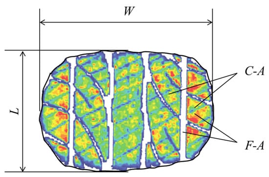 The geometric characteristics of tire–pavement contact mainly refer to the contact area and contact shape. There is no clear definition of contact characteristics in the field of pavement engineering; however, the geometric characteristics of tire–pavement contact are summarized and defined in the field of tires, and “Tire Terms and Their Definitions” (GB/T 6326-2005) [31] define the tread contact length (L), tread contact width (W), coefficient of contact (L/W), contact area (C-A), and footprint area (F-A), as shown in Figure 2.
