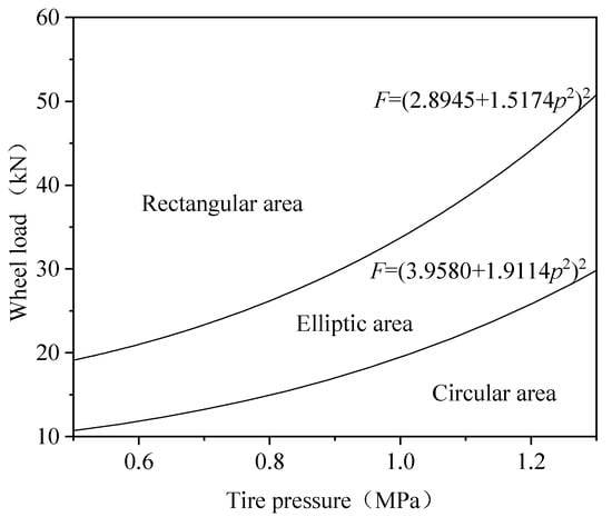 The tire–pavement contact area is usually assumed to be circular or rectangular with uniform pressure distribution. This can simplify mechanical calculations and reflects tire–pavement contact behavior to a certain extent, and is widely used in pavement design [32]. However, measurements and modeling data show that the vertical stress distribution at the tire–pavement interface is not uniform, and the contact area is not regularly circular [29] or rectangular [33,34]. Tire pattern and pavement texture influences are ignored in this assumption, so researchers have conducted extensive research on contact geometric characteristics [35,36]. Pillai et al. [37] used the tire footprint to determine the tire–pavement contact area and obtained two simple predictive equations for tire–pavement contact area based on tire deflection and tire and wheel dimensional parameters found on the tire sidewall, as shown in Equations (1) and (2), with an error between the calculated and measured footprint areas within 15%. Ge and Wang [38] established a tire–pavement contact finite element model using ABAQUS to simulate the tire–pavement contact process and obtain a contact area equation based on tire pressure and wheel load, as shown in Equation (3). A quantitative expression of tire contact characteristics under vehicle load was obtained, as shown in Figure 3.