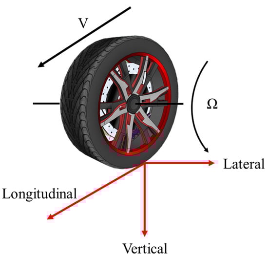 Tire–pavement contact creates stresses and forces. These tire–pavement contact stresses and forces provide the driving force when the vehicle accelerates, the lateral force when it rotates, and the braking force when it decelerates, and it can be seen that the contact behavior is directly related to vehicle performance [41] and pavement performance [42,43]. Therefore, it is significant to conduct contact mechanical characterization studies. When a tire is in contact with pavement, the tire is subjected to a complex load through the complex deformation of the tread and carcass. This complex load is generally described in the study of tire–pavement contact dynamics as the six tire forces, which are vertical force, longitudinal force, lateral force, aligning torque, lateral tilt moment, and rolling resistance moment. Some of these forces are shown in Figure 4. Due to the large deformation of a tire in mutual contact with pavement coupled with the environment and load, these forces are coupled with each other and affect each other [39,44].