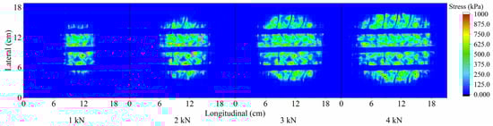 The vertical forces are of most concern in pavement studies. Marshek et al. [45] attempted to test the pressure distribution footprint of diagonal truck tires using pressure-sensitive films, and their results showed that the contact pressure was non-uniformly distributed and that the contact pressure at the tire shoulder was significantly greater than the tire air pressure. Wang et al. [46] analyzed the non-uniformity of vertical contact stresses and found that the non-uniformity of stress distribution decreases with increasing load but increases with increasing inflation pressure. Gong et al. [47] used a high-precision pressure sensor to test the tire–pavement contact pattern and stress under different forces, as shown in Figure 5. It can be seen that with an increase in force, the contact area and the region of stress concentration gradually increase. The distribution of vertical contact stresses is not uniform.