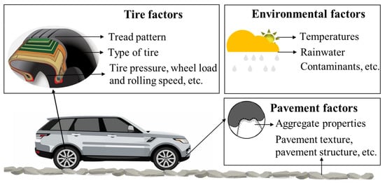 Many factors influence tire–pavement contact characteristics, but the main ones are tire factors, pavement factors, and environmental factors, as shown in Figure 6. Tire factors such as tire tread, type, and pressure all have an effect on contact area and contact stress. The pavement and the environment are equally important in influencing the contact characteristics.