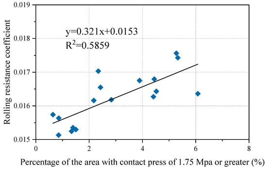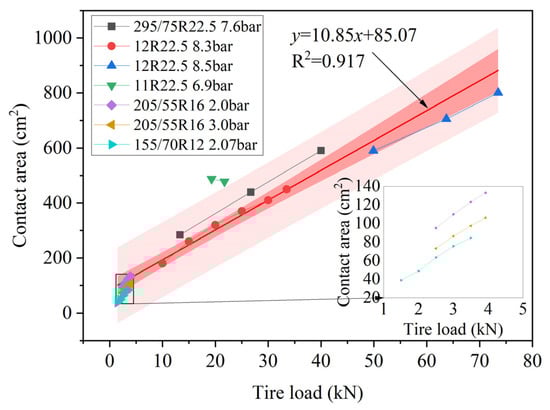 In the case of tires, the type of tire, tire pressure, tread pattern, wheel load, and the rolling speed of the tire all impact tire–pavement contact. Xie and Yang [30] analyzed the effect of tire type on contact stress by establishing a tire–pavement three-dimensional finite element model. The results showed that with the increase of vertical load, the position of the maximum contact stress between the diagonal tire and the pavement changed from the inner side of the tread to the outer side, while the maximum contact stress between the radial tire and the pavement always appeared in the middle of the tread. Under the same working conditions, the maximum contact stress between radial tires and pavement is greater than the maximum contact stress between diagonal tires and pavement. Furthermore, the change in lateral contact stress under different ribs of diagonal tires is smaller than that of radial tires. In this paper, the contact area of different tires was quantified, as shown in Figure 7. It can be seen that there are differences in the contact areas of different tire types, although this broadly conforms to the law that the larger the tire load, the larger the contact area. All the points in Figure 7 are linearly fitted, which achieves a good fitting effect. According to the 95% prediction band, the contact area of different tires also varies within a certain range.