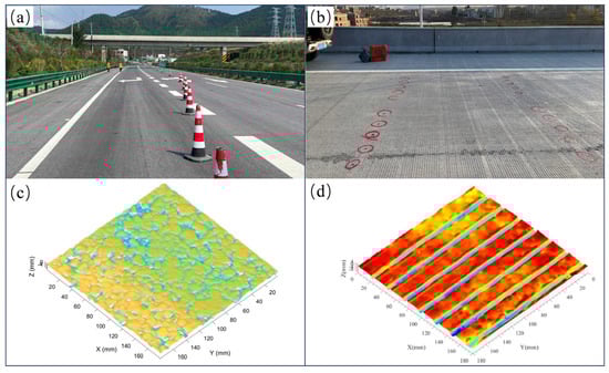Asphalt and cement pavements: (a) Asphalt pavement; (b) Cement pavement; (c) Asphalt pavement texture; (d) Cement pavement texture.