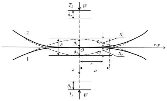 The study of tire–pavement contact behavior is not limited to experimental studies. Many researchers have constructed different contact models and carried out analyses [87,88,89]. One of the most classic contact models is the elastic contact model proposed by Hertz, which is also the basis for many subsequent classic models [90]. For the first time, Hertz treated the elastomer as a quadric and analyzed its deformation and contact problems, as shown in Figure 9. The contact radius and contact stress can be calculated directly from the model, as shown in Equations (4) and (5).