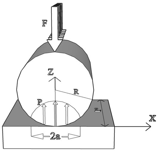 where W is the applied load; R is the compound curvature, ; E* is the contact modulus, ; E is the elastic modulus; v is the Poisson ratio; a is the radius of the contact circle; P(r) is the contact pressure; and r is the distance from the point to the contact center.