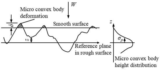 In 1966, Greenwood and Williamson [92] proposed a mixed elastic and elasto-plastic contact model between rough and smooth surfaces based on statistical analysis, i.e., the G–W model, as shown in Figure 11. Their results showed that the actual area of objects in contact with each other, the number of micro-convex bodies, and the load generated by the contact are all related to the probability density function of the height of the surface form profile. The actual contact area is shown in Equation (8), and the actual average pressure is shown in Equation (9), where p(z) is a function of the probability density.