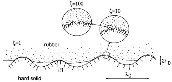 To further improve the accuracy of the tire–pavement model, Majumdar and Bhushan [93] introduced the fractal geometry theory and proposed the M–B fractal contact model using the W–M fractal function. This model, compared with the G–W model, includes fractal characteristics of the rough surface and can provide a quantitative representation of the relationship between surface roughness and the true contact area and the elastic and plastic contact area, respectively, as well as reflecting the relationship between load and contact area. Subsequently, Persson [94] proposed the surface fractal friction theory, which is based on the fractal characteristics of the pavement surface and the power spectrum density to model the tire–pavement contact. This model is widely used for tire–pavement friction analysis and reflects the skid resistance of the pavement by calculating the dynamic friction factor, which is calculated as shown in Equation (10). The contact state is shown in Figure 12, where C(q) is the road surface spectral density; and p(q) and G(q) are the fractal characteristic functions, where q is the wavelength and is related to the amplification factor ζ. Persson analyzed experimental data on tire–pavement contact using Persson contact mechanics and rubber friction theory with better results [95,96].