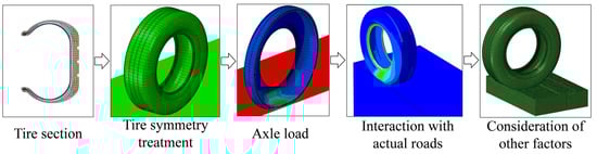 Although various tire–pavement contact models are available to analyze tire–pavement contact behavior and even the influence of pavement surface properties on the contact behavior, these models all assume the geometry and height distribution of a micro-convex body while ignoring the interaction between different contact zones; therefore, the usability of these models is very limited. With the development of computer technology, some researchers have begun to simulate tire–pavement contact behavior on computers and calculate tire–pavement contact stresses and contact areas via numerical simulation [14,60,97]. The modeling process is shown in Figure 13; contact behavior analysis is carried out by constructing models of tires and road surfaces, and some models even consider the water factor and can carry out water-wading calculations.