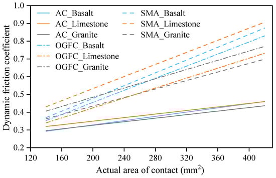Firstly, pavement skid resistance has been previously studied. Peng et al. [100] developed a skid-resistance simulation framework based on a finite element method using in situ 3D pavement texture and skid resistance data. The relationship between each contact feature and the interface friction parameters was quantified by principal component analysis and regression analysis. The results of the study provided better friction parameter inputs for finite element simulations. Najafi et al. [101] concluded that friction is reduced and vehicle crash rates are increased under wet weather conditions due to the water on the pavement reducing the contact area between the tire and the pavement. Yun et al. [5] also realized the problem of friction change and studied the effect of contact area on the friction coefficient. The relationship between pavement texture and contact area was investigated; the surface textures of 29 pavements were scanned; and the skid resistance of 23 of them and the tire–pavement contact area of some were also measured. The results showed that the contact area is influenced by the roughness of the pavement; the contact area decreases as a power function of the root-mean-square surface height; and the low-speed tire–pavement friction coefficient under dry conditions is not influenced by the real contact area, while the friction coefficient under wet conditions is weakly positively correlated with the real contact area. Yu et al. [102] used a pressure-distribution-mapping system, FPD-8010E, and a tire–pavement dynamic friction analyzer to test the contact area and friction coefficient of different pavements. They found a close linear correlation between the actual tire–pavement contact area and the dynamic friction coefficient (DFC), as shown in Figure 14. It can be seen that the DFC gradually increases as the actual area of contact increases, but this correlation varies with pavement type and aggregate type. Skid resistance is certainly related to tire–pavement contact behavior, but it is also influenced by many other factors, such as aggregate type [103], pavement gradation [104], etc. In summary, the analysis of pavement skid resistance requires a comprehensive understanding of tire–pavement contact behavior.
