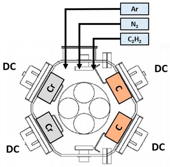 - DLC deposition: Finally, the DLC top layer is deposited by closing the N2 gas inlet and switching off the Cr targets. The C2H2 gas flow and graphite targets are kept constant for 2 h.