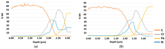 Figure 4 depicts the results obtained from GD-OES analysis, revealing a coating with a 3 µm thickness. The distribution of elements within the coating was as follows: The initial 1.80 µm layer contains an 80% weight percent concentration of C, followed by a 0.80 µm layer composed of Cr and N. Moving further into the coating, the proportion of N gradually declines, while the concentration of Cr increases, reaching 70% at a depth of 2.50 µm. Beyond this point, the Cr content diminishes, eventually transitioning to the substrate. In the case of the nitrided specimen, the nitrogen content remains constant at 20%, reflecting the impact of the prior nitriding process.