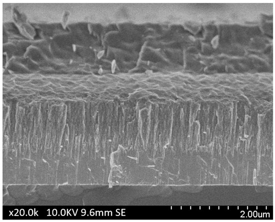 Additionally, Figure 6 illustrates the SEM cross-sectional view of the coating, revealing a compact but columnar structure characteristic of DLC coatings. It is also possible to observe the clearly differentiated layers that constitute the whole coating. A first chromium adhesion layer is followed by CrN and CrCN layers, and, finally, the most carbon-rich one. These results are consistent with those obtained using the GDOES technique (Figure 4b) and Calotest (Figure 5).