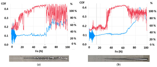Example of a scratch test. Friction coefficient (blue) and acoustic emission (red). Coated and nitrided Caldie sample (a). Coated and non-nitrided Caldie sample (b).