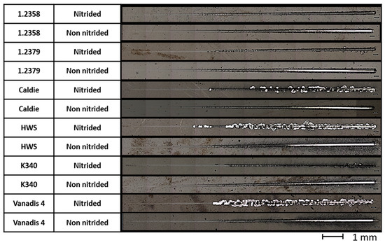 Figure 10 displays microscopy images that reveal the scratch test grooves. Notably, the examination of the nitrided specimens (Caldie, HWS, and Vanadis 4) revealed that substrates became exposed at an earlier stage of the test than expected. As a result, the coating became completely delaminated from the underlying material. This observation is significant and indicates a distinct behavior of the nitrided samples during the scratch test.