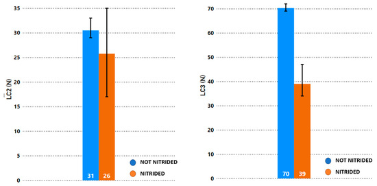 The results of LC2 and LC3 for all specimen combinations can be found in Table 4. There was a clear difference in the value range between nitrided and non-nitrided specimens. Without nitriding, LC2 results ranged from 26 N to 33 N and LC3 results ranged from 67 N to 72 N. In contrast, nitrided specimens exhibited LC2 values ranging from 17 N to 31 N and LC3 values ranging from 28 N to 47 N. The reduction in LC3 values, above all, was particularly remarkable.