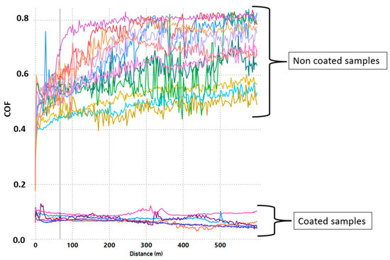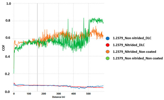 Figure 13 displays the results obtained from all specimens with substrate 1.2379. Similarly to the other cases, the coated specimens were in the region of 0.1, while the uncoated specimens were approximately around 0.6. Notably, the uncoated and non-nitrided specimen displayed an increase in COF up to 0.8 at the end of the test.
