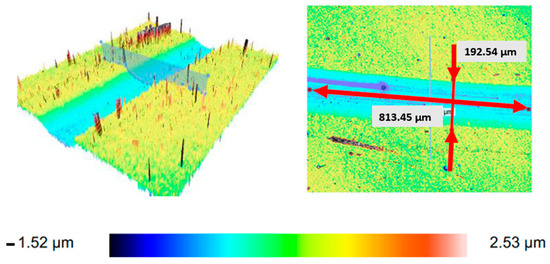 Two distinct methods were employed to evaluate volume reduction and the wear coefficient. The first procedure included determining the width of the wear track in accordance with the ASTM G99 regulation, which consequently provided the values for the volume reduction and wear coefficient. The regulation necessitated the calculation of the overall volume reduction using the measured width of the wear track. Subsequently, the wear coefficient was normalized using a formula that related it to the applied load and total sliding distance in the first method. Conversely, the second method employed direct volume loss calculation through a confocal microscope and the Sensoview program (Figure 14). An example of the aspect of the wear tracks obtained after the friction and wear tests was obtained by confocal microscopy. This case was a sample of 1.2379 which was coated and not nitrided. The obtained value was then extrapolated for the whole wear track, following the equation provided in Formula (1). Finally, the wear coefficient was calculated utilizing the same equation as in the initial method.