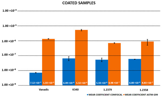 Figure 15 presents the results of the coated and non-nitrided samples. In this situation, the results obtained through confocal were more than 1.00 × 10−8 mm3/Nm, indicating a significant difference of three magnitudes compared to the specimens without coatings. This supports previous research and confirms the observations made by other researchers, who consistently found similar differences in magnitude. Feng et al. [44] achieved a similar wear coefficient of 2.11 × 10−7 mm3/Nm using a DLC and HSS combination. Also, Chang et al. [45] obtained 2.11 × 10−7 mm3/Nm using their DLC coating. In addition, it is important to mention that the nitrided samples were analyzed but rejected due to their poor results in the nanoindentation and scratch evaluations. Therefore, the emphasis now shifts to finding the ideal combination for field testing on cold-formed components. The search for this ideal mix is crucial to progressing our research in this area, and it continues to be a key goal as we aim to improve the effectiveness and longevity of these necessary parts.