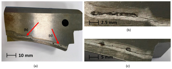 In Figure 17, the uncoated tool is depicted following a rigorous run of 300,000 cycles. Upon closer examination of Figure 17b,c, the details show that the identified cracks exhibit a more significant depth than those observed in the earlier Figure 16. Notably, these fissures seem to have deepened over the extended operational period, marking a progression in their severity. Figure 17b showcases these deeper cracks, suggesting an increased level of structural compromise within the tool. Moving to Figure 17c, a concerning development is evident—a more substantial crack expanded, resulting in a partial fracture of the tool. This breach in the tool’s integrity is visibly conspicuous, indicating the profound impact of cyclic loading and stress over an extended period. The progression from smaller, superficial cracks in Figure 16 to these deeper and now structurally compromising cracks in Figure 17 underlines the incremental degradation of the tool. This gradual deterioration exemplifies the critical impact of cyclic stress and the formation of cracks, ultimately leading to a partial failure of the tool. Such developments emphasize the criticality of maintaining tools in optimal condition to prevent significant failures and uphold operational efficiency.