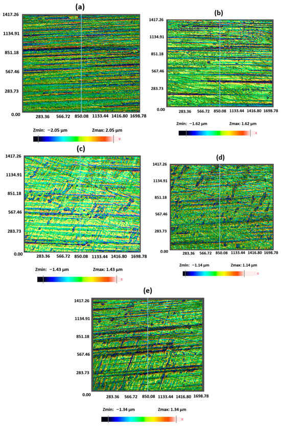 Figure 19 exhibits a range of images of the same area (analysis zone of Figure 18), allowing for observation of the changes that the surface of the tool was subjected to during its working life. Figure 19a represents the surface before use, which had a Sa value of 0.5309 µm, which is consistent with previous observations [46]. In this picture, the grooves that resulted from the grinding of the parts are visible, a typical component of cold stamping tools. Figure 19b, on the other hand, shows that measurements of the surface after 80,000 cycles led to an Sa value of 0.3829 µm. The grinding grooves decreased, revealing the initial marks from material displacement. Figure 19c displays the surface after 160,000 cycles with a Sa 0.3602 µm. The marks showed that the material displacement became more distinct, and the direction of material flow was observable. Figure 19d shows the surface after 320,000 cycles, with a Sa value of 0.2881 µm. Figure 19e presents the surface after 580,000 cycles, with a Sa 0.3401 µm. It can be noted that the material displacement created new vertical grooves while the horizontal scratches remained. The direction of the grooves plays a significant role in determining friction. The images illustrate the gradual changes in the surface. Holmberg et al. [47] studied this behavior, highlighting the importance of surface direction in influencing friction.