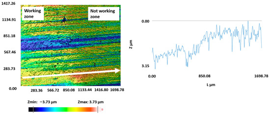 Z profile (λS = 8.00 µm, λC = 0.08 mm) of the transition between the working (580,000 cycles) and non-working zones.