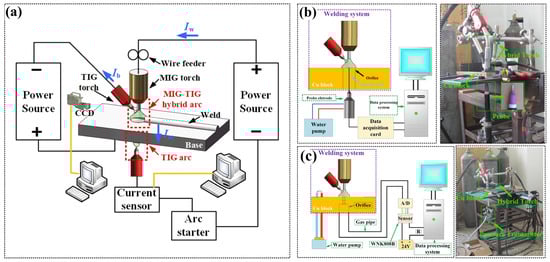 - Zheng, Y.; Huang, J.H.; Cheng, Z.; Gao, W.; Zhang, Y.F.; Chen, S.H.; Yang, J. Combined effects of MIG and TIG arcs on weld appearance and interface properties in Al/steel double-sided butt welding-brazing. J. Mater. Process. Technol. 2017, 250, 25–34. [Google Scholar]