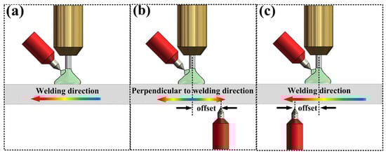 Experimental content of BCO-DASW with different variables: (a) without back arc; (b) offset perpendicular to welding direction; and (c) offset along to welding direction.
