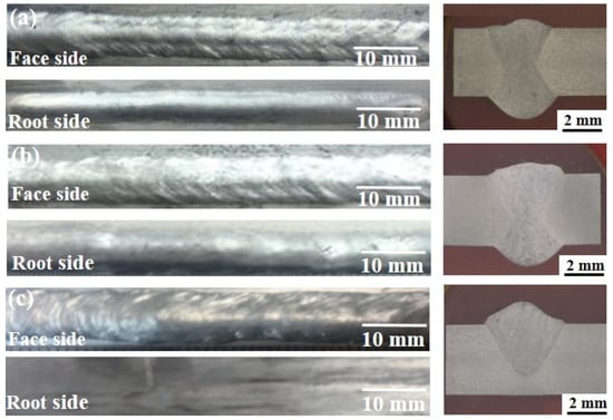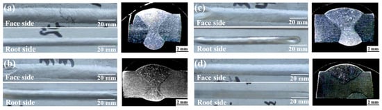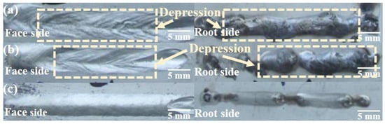 Figure 4 compares the experiment results of the BCO-DASW without the back arc. It can be found that when the main current (Iw) was 130 A (case 1 in Table 1), the molten pool had an obvious depression phenomenon, which led to the face side of the weld collapsing and the root side of the weld being poorly formed. Furthermore, keeping the total current unchanged, when the bypass current (Ib) was set at 20 A (case 2 in Table 1), it can be found that the depression phenomenon of the molten pool still existed. When the bypass current was 40 A (case 3 in Table 1), the molten pool depression phenomenon was eliminated, and the weld surface was bright and evenly. This indicates that the MIG-TIG hybrid process can redistribute the heat input to improve the stability of the weld pool compared to the conventional arc.