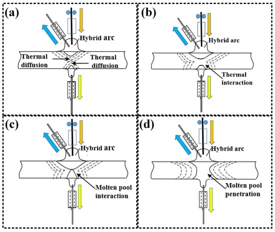 Analysis of the BCO-DASW process mechanism for 6061 aluminum alloy is displayed in Figure 7. In the initial stage of welding, both ends of the substrate started to melt under the action of the BCO-DASW hybrid arc. The heat from the arcs at both sides of the substrate gradually spread to the center of the base metal, as shown in Figure 7a. With the thermal accumulation, the volume of the molten pools at both sides of the base material gradually increased, while the heat-affected zone produced a superimposed action effect, as shown in Figure 7b. With the further accumulation of heat, the molten pools at the front and back of the sheet started to contact each other and melted through the base metal, as shown in Figure 7c,d. Combined with the above experiment, the center line of the back arc and the top arc did not deviate too much. The excessive distance made the heat-affected zones of the base material deviation, and thus not enough heat accumulates in the middle of the sheet, and the base material did not melted through the substrate. Furthermore, the main current is the key to the formation of the base material penetration. However, the aluminum alloy molten pool collapsed due to the excessive current. The introduction and regulation of the bypass arc ensured the penetration of the base metal and eliminated the depression of the molten pool. Accordingly, it was necessary to carry out an in-depth study on the thermal force regulation mechanism of the bypass arc for the DASW hybrid process.