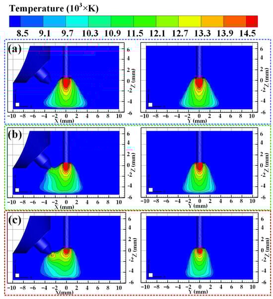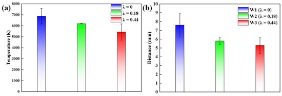 Figure 10 and Figure 11 compare the temperature field distribution at the bottom of the arc with the λ increase. It can be found that, when λ is equal to 0, the thermal field of the hybrid arc bottom has the highest peak temperature and the widest range of action comparing λ = 0.18 and λ = 0.44. From the physical experiment, the molten pool depression of 6061 aluminum alloy occurred. In contrast, the thermal field at the bottom of the composite arc had the lowest peak temperature and narrowest range of action. At this point, the results of the physical experiment demonstrated that the molten pool depression phenomenon was eliminated. Specifically, when λ = 0, the maximum temperature of the hybrid arc was 6877 K, and the action range of the high-temperature plasma perpendicular to the welding direction was 15.2 mm; when λ = 0.18, the maximum temperature of the hybrid arc was 6200 K, and the action range of the high-temperature plasma perpendicular to the welding direction was 11 mm; and when λ = 0.44, the maximum temperature of the hybrid arc was 5433 K, and the action range of the high-temperature plasma perpendicular to the welding direction was 10.6 mm. It can be found that when the distribution coefficient is increased by 0.44, the maximum temperature of the hybrid arc decreases by 1444 K, and the action range decreases by 4.6 mm. This indicates that the BCO-DASW has a highly efficient energy regulation mechanism for the welding process of medium-thick plate 6061 aluminum alloy. Moreover, combined with the above experimental results, there is no obvious defect in the weld channel under the BCO-DASW process, which indicates that the redistribution of heat inhibits the tendency of thermal cracking of 6061 aluminum alloy, and thus improves the weld quality.