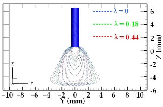 Calculated results comparison of arc morphology with different λ: (a) λ = 0; (b) λ = 0.18; and (c) λ = 0.44.
