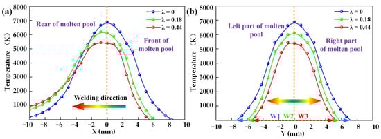 Comparison of temperature field at the bottom of the hybrid arc with different λ: (a) along welding direction; (b) perpendicular to the welding direction.