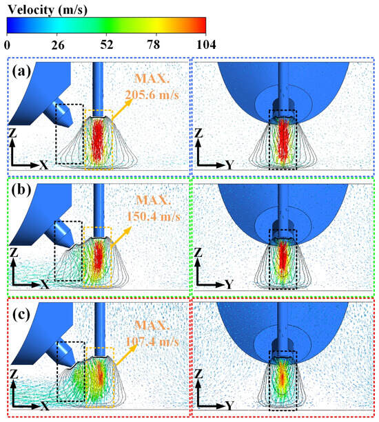 Figure 12 compares the flow behaviors of charged particles inside the hybrid with different λ. In general, the gas phase particles entered the arc zone and then were activated into high-temperature plasma gas clusters under the excitation of the electromagnetic field. It was found that, when λ was equal to 0, the maximum velocity of the charged particles was 205.6 m/s; when λ was equal to 0.18, the maximum velocity of the charged particles was 150.6 m/s; and when λ was equal to 0.44, the maximum velocity of the charged particles was 107.4 m/s, as shown in the orange dashed box. Furthermore, the high-velocity charged particles were mainly concentrated in the middle of the arc. When the bypass arc was introduced, the conductive area of the hybrid arc increased along the welding direction, increasing the speed of some charged particles entering the arc, as shown in the black dashed box. Specifically, when λ was equal to 0, its average speed was about 21 m/s; when λ was equal to 0.18, its average speed was about 41 m/s; and when λ was equal to 0.44, its average speed was about 59 m/s.