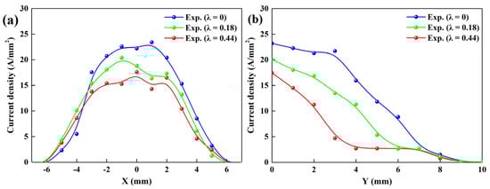 Comparison of the current density measurement experiment: (a) along welding direction; and (b) perpendicular to the welding direction.