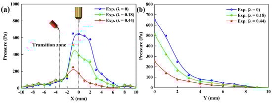 Figure 13 and Figure 14 compare the current density and arc pressure measurement results at the bottom of the hybrid arc with different λ. It was found that the current density at the bottom of the arc tends to decrease gradually as the λ increases no matter along or perpendicular to the welding direction. When λ was equal to 0, the peak arc bottom pressure was 650 Pa; when λ was equal to 0.18, the peak arc bottom pressure was 512 Pa; and when λ was equal to 0.44, the peak arc bottom pressure was 249 Pa. In addition, along the welding direction, the action range of the peak arc bottom pressure was about 4 mm; perpendicular to the welding direction, the arc bottom pressure decreased with the increase in distance from the center. Overall, the arc pressure and the current density had the same tendency along the welding direction and perpendicular to the welding direction, respectively. When λ was elevated by 0.44, the maximum decrease in arc pressure was about 401 Pa, which was located in the center region of the arc. This was because when λ is 0, the particle flow velocity at the center of the arc was about 1.9 times higher than that when λ was equal to 0.44. In addition, at the front of the arc, on the other hand, the arc pressure and current density were slightly higher when λ was equal to 0.44 compared to the other two cases. This is due to the introduction of the bypass arc leading to an increase in the conductive area of the arc zone, and thus the velocity of the particles moving under the tungsten pole is enhanced by a factor of 2.8. However, due to the overall lower velocity of the particles at the front of the arc, the pressure level is also overall lower. Combined with the above analysis, the BCO-DASW hybrid arc has a good thermal fluid force regulation mechanism, and thus has good adaptability to the welding process for medium-thickness plates of 6061 aluminum alloy.
