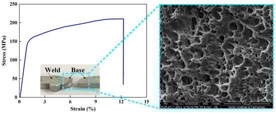 Finally, Figure 15 shows the fracture morphology of the tensile specimen under the BCO-DASW process when λ is equal to 0.44. The specimen fractured at a distance of 6 mm from the weld at the base metal, away from the heat-affected zone, and the port showed a typical ductile fracture. From the stress–strain curve, it was found the first half of the loading is a linear transformation. When it reached 160 MPa, the curve started to flatten which meant that the specimen yielded at this time and continued loading until 210 MPa, the joint fracture point. The tensile experiment results show that the strength of the joint welded by the BCO-DASW is higher than the base material, which indicates that the thermal and force regulation mechanisms have favorable strength-enhancing effects.