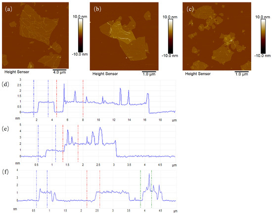 Figure 2c,f show that type C GO flakes had an irregular lamellar structure, with the majority having a thickness of approximately 1 nm and lateral dimensions of approximately 3 μm. The sheet diameter of type A GO flakes was larger than those of type B and C GO flakes, whereas the thickness of type B GO flakes was greater than that of type A and C GO flakes.