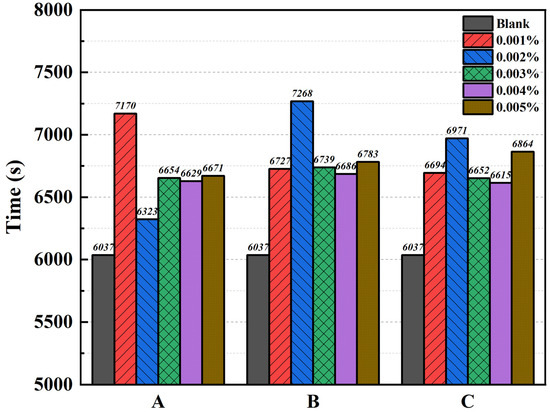 Figure 3 shows the effect of various concentrations of the three types of GO flakes on the fire-resistance times of the coatings. The fire-resistance times of coatings containing 0.001%, 0.002%, 0.003%, 0.004%, and 0.005% of type A GO flakes were 7170 s, 6323 s, 6654 s, 6629 s, and 6671 s, respectively. As can be seen, the coating containing 0.001% of type A GO flakes had the longest fire-resistance time, which was approximately 18% longer than that of the blank. The coatings containing 0.002%–0.005% type A GO flakes also had significantly longer fire-resistance times than the blank. The smallest enhancement in fire-resistance performance was exhibited by the coating containing 0.002% type A GO flakes. This was likely due to the agglomeration of GO flakes, which would have decreased the homogeneity of their dispersion.