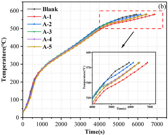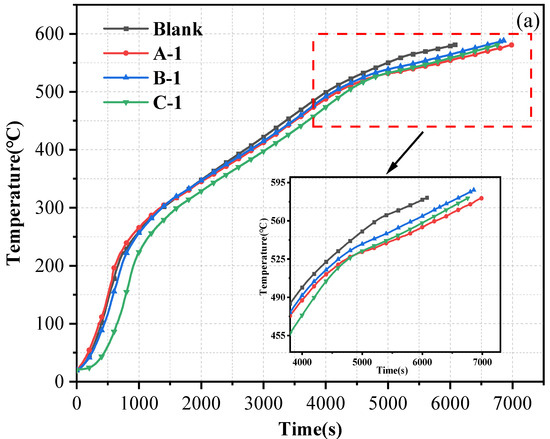 23]. When the back temperature of the sample reaches 580 °C, the test is stopped. The time from the start of temperature rise to the back temperature of the sample reaching 580 °C is the fire-resistance performance of the sample [